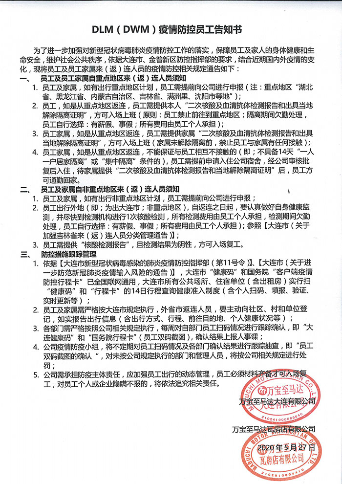 DLM(DWM)五·一假期疫情防控員工告知書